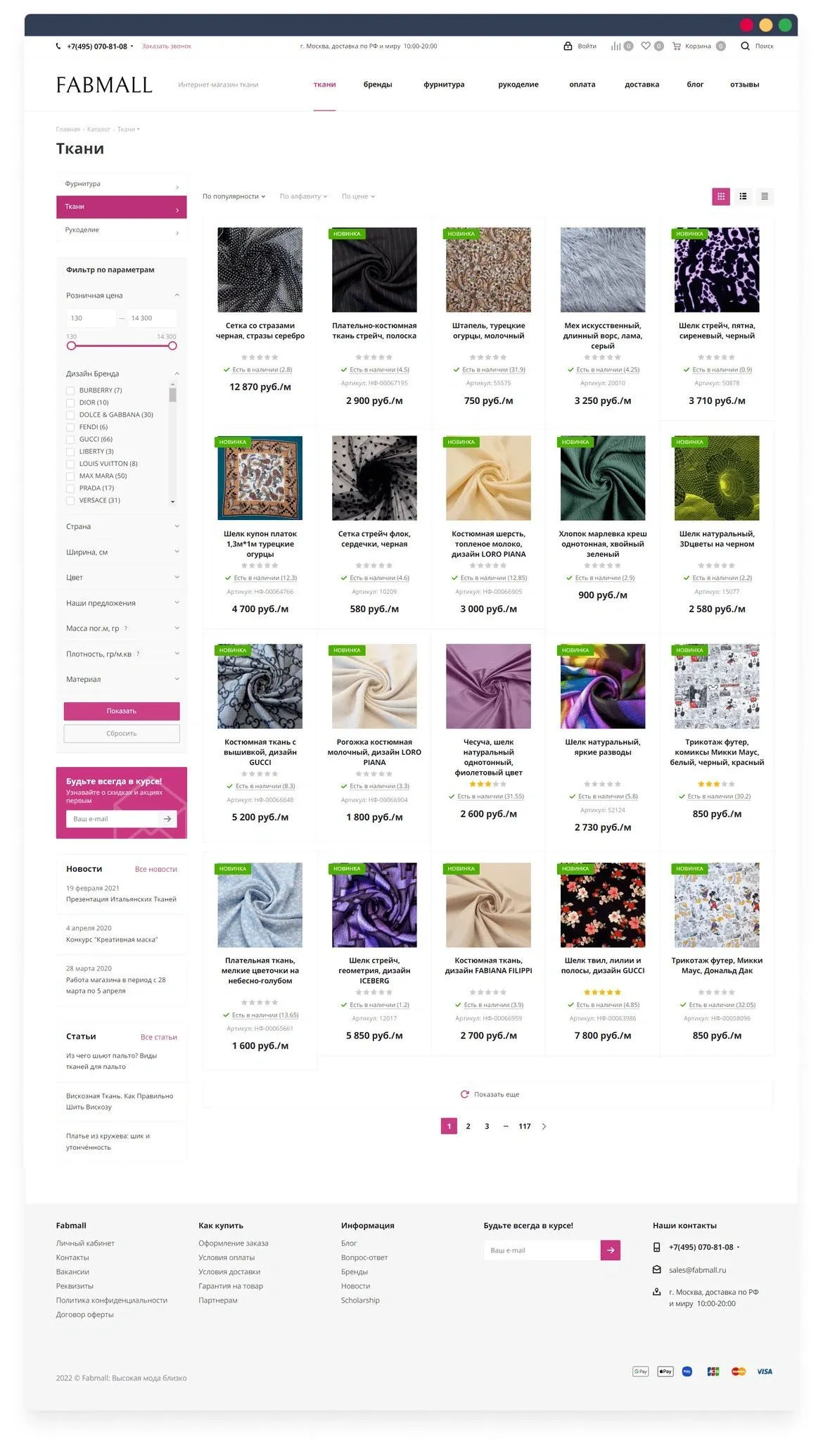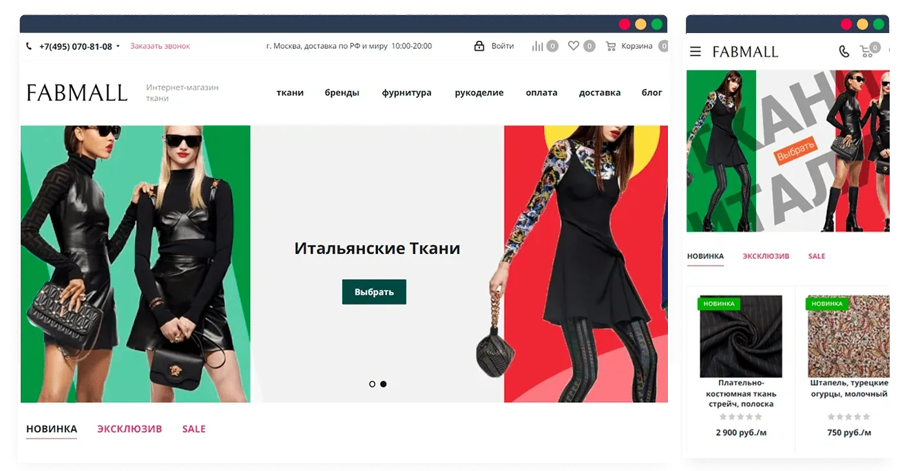 Цель: создать интернет магазин тканей и фурнитуры со стильным дизайном, понятным интерфейсом и удобной навигацией. Сделать его конкурентоспособным для бизнеса, качественным для поисковых систем и интересным для покупателей. Реализовать возможность загрузки товаров и предложений из 1С.