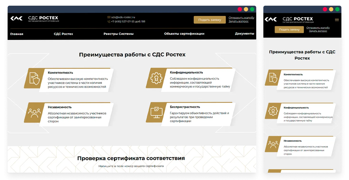 Компания Ростех осуществляет добровольную сертификацию различных систем менеджмента, оптимизации производства и управления, безопасности труда и прочих объектов. Компания уже имела собственный сайт, но обратилась к нам за обновлением ресурса, оптимизацией и настройкой максимальной безопасности для основного сайта и дочерних компаний, а также приведению сайта в надлежащий вид на 2023 год.